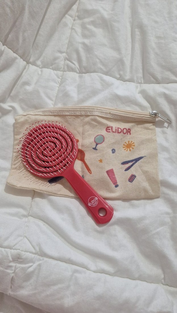 Elidor esnek kıllı saç fırçası, güzellik temalı baskılı kumaş taşıma çantası ile birlikte gelir. Nazikçe açma için tasarlanmıştır.