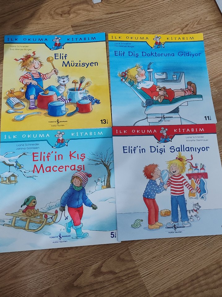 Elif'in diş doktoruna gitmesi, kış macerası ve müzisyenlik gibi eğlenceli hikayeler içeren 4 kitaplık ilk okuma seti.