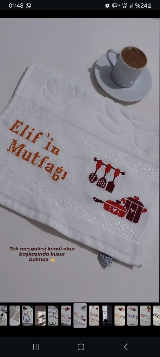 Beyaz zemin üzerine 'Elif'in Mutfağı' yazılı ve mutfak eşyaları işlemeli mutfak havlusu. Üzerinde "Tek meşgalesi kendi olan başkasında kusur bulmaz" yazısı bulunur. isim yazilir