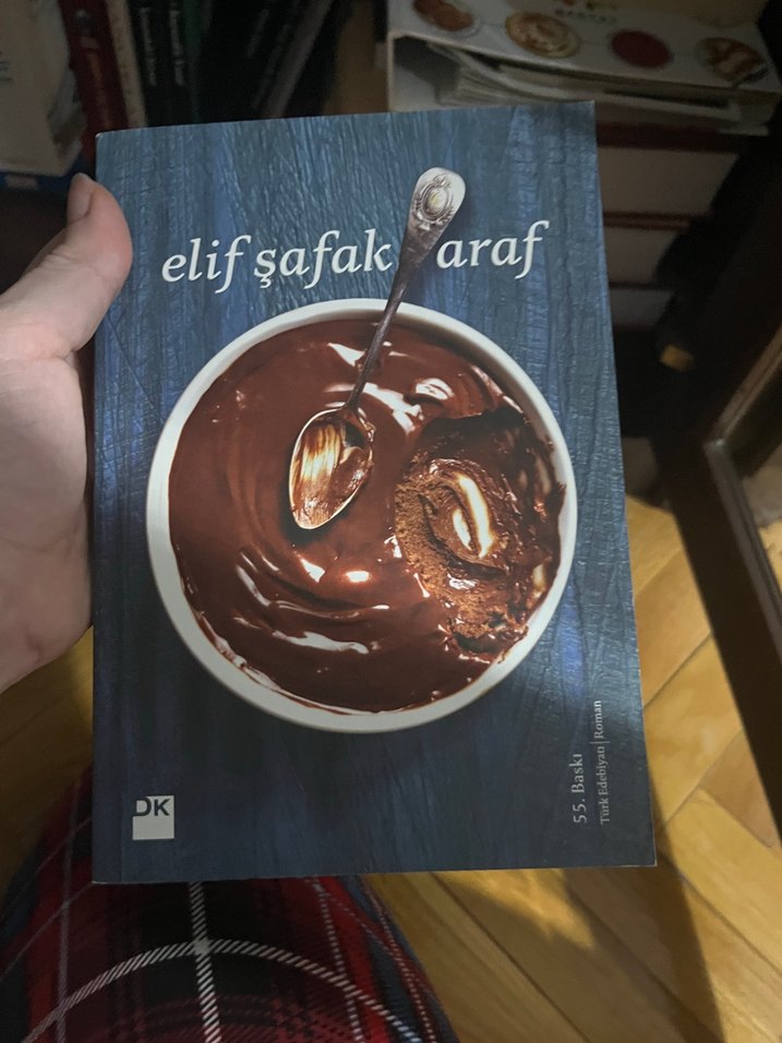 Elif Şafak imzalı 'Araf' kitabı, kapağında çikolata dolu bir kase ve kaşık bulunuyor. Yayıncı DK'dir.