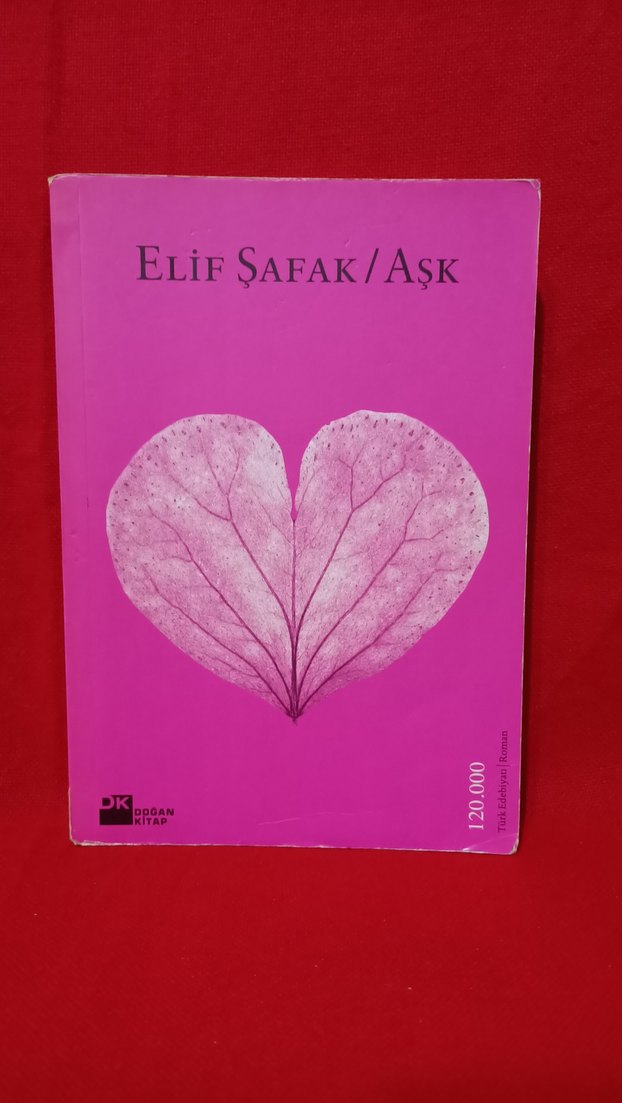 Elif Şafak'ın "Aşk" romanı, kalp şeklinde yaprak desenli pembe kapak tasarımıyla dikkat çekiyor. Kitap orjinal bandrollü ve temiz durumdadır kapağın kenarında küçük bir yırtılma var fakat okumaya engel sorunu yoktur sayfaları tamdır temizdir