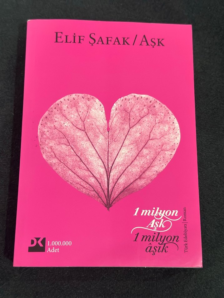 Elif Şafak'ın 'Aşk' romanı, üzerinde kalp şeklinde bir tasarım bulunan pembe kapaklıdır. 1 milyonun üzerinde satış yapmıştır. ❤️