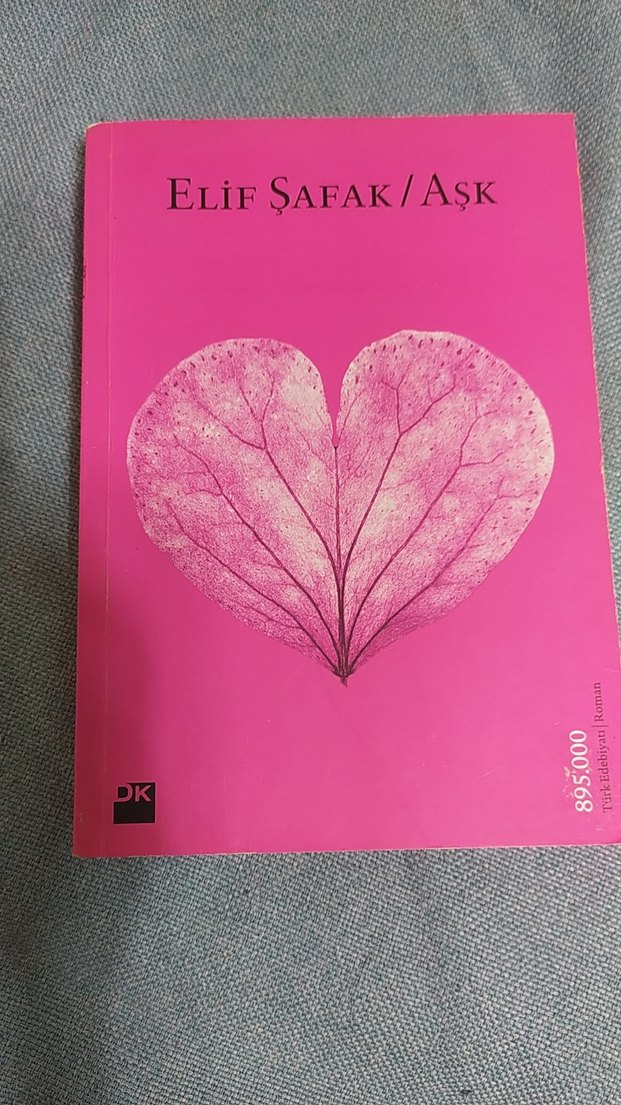 Elif Şafak'ın Aşk romanı, pembe kapak ve kalp şeklinde yaprak illüstrasyonuna sahip. DK yayınevi tarafından basılmıştır. 241 ve 242. sayfalari yırtık olduğu için eksik yerlere fotokopi olarak ekleme yapıldı.