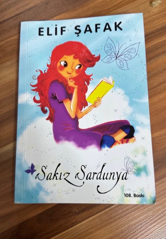 Elif Şafak'ın 108. baskı çocuk kitabı 'Sakız Sardunya', kitapta kitap okuyan kızın renkli çizimi yer alıyor.