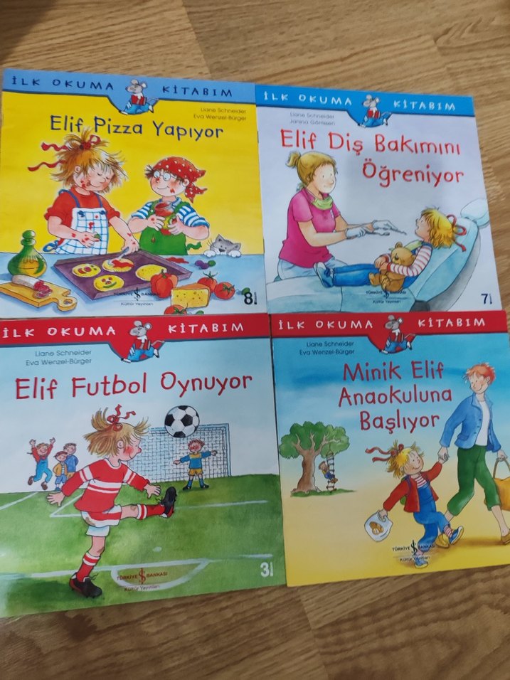 Elif'in pizza yapmayı, futbol oynamayı, diş bakımını öğrenmesini ve anaokuluna başlamasını anlatan çocuk kitapları seti.