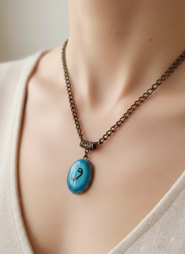 Arapça Elif ve Vav harflerinin iç içe hat yazı ile (kaligrafi) işlendiği, bakır ve oval formda tabana turkuaz renkli taş görünümü ile vintage tarzda oluşturulmuş kolye ucu.. Sıfır mağaza satış ürünüdür