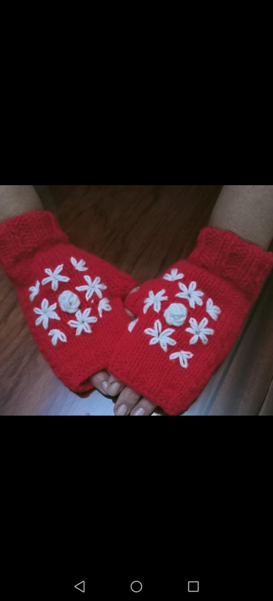 Yumuşak örgüden yapılmış, beyaz çiçek nakışlı kırmızı kadın eldiveni. Rahat ve klasik tarzda, elleri sıcak tutar. #eldiven#elişieldiven#örgüeldiven#tasarımeldiven#