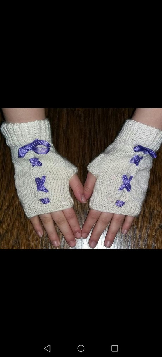 Elişi Mor Kurdele Detaylı Krem Örgü Eldiven