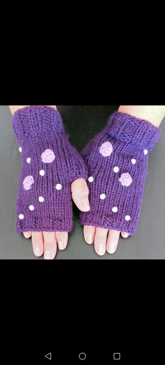 Mor renkli, açık parmaklı örgü kadın eldiveni. Küçük çiçek ve inci detayları ile süslenmiş, yumuşak ve rahat kumaş. Bohem tarzına uygun. #eldiven#elişieldiven#örgüeldiven#tasarımeldiven#