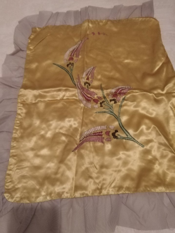 Parlak altın renkli, geleneksel işlemeli çiçek desenleriyle süslenmiş masa örtüsü, masanıza klasik bir dokunuş katıyor.