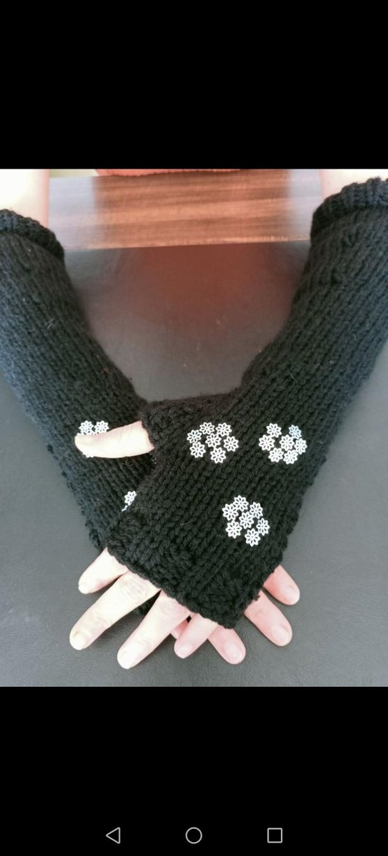 Siyah örgü, parmakları açık eldivenler, çiçek desenleriyle rahat ve gotik tarzda. Yumuşak örgü kumaş, bohem ve retro görünüm sunar. #eldiven#elişieldiven#örgüeldiven#tasarımeldiven#