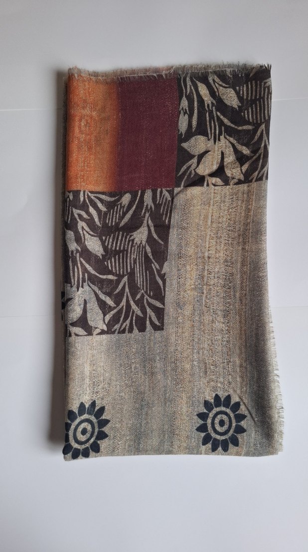 Kahverengi ve gri renklerin karışımıyla desenli, bohem tarzda drapeli tekstil şal. Retro ve hippie havası taşıyor.