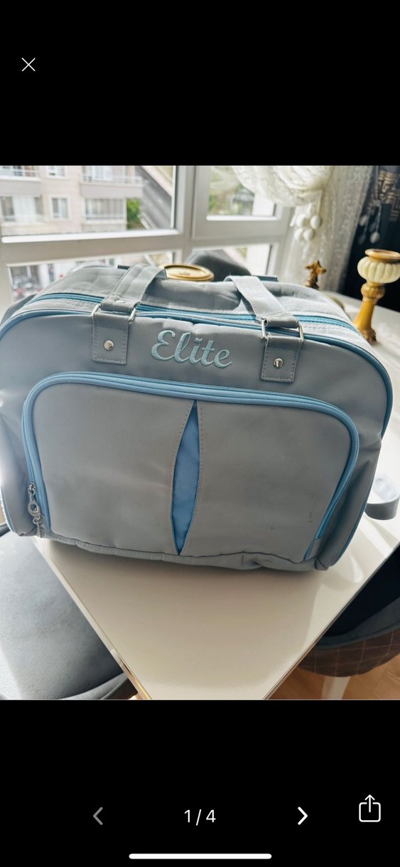 Elite marka gri baskılı bebek çantası, dayanıklı saplar ve ekstra saklama için ön fermuarlı cep içerir.