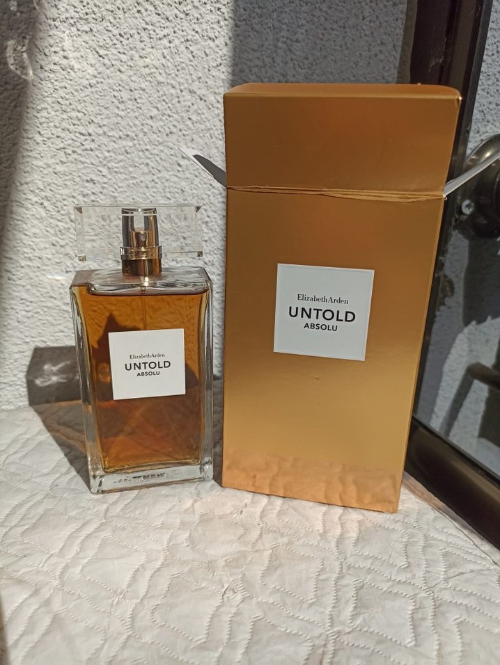 Elizabeth Arden Untold Absolu, kadınlara özel amber renkli şık bir parfüm. Şeffaf dikdörtgen şişede, altın renkli sprey başlık ve kutu ile sunulur.