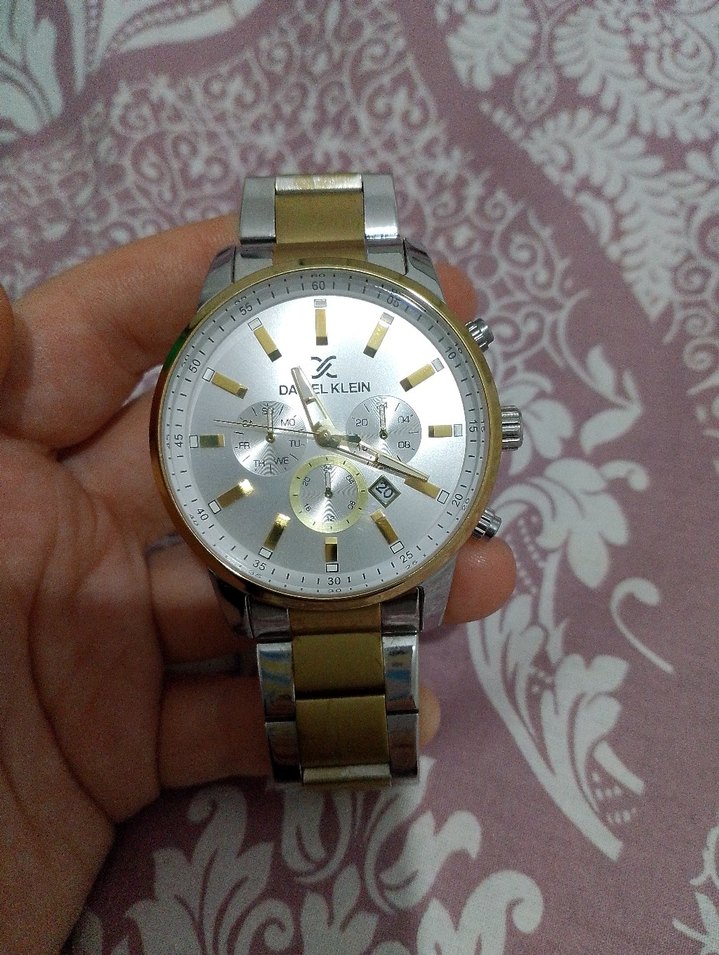 Elklein erkek saati, parlak altın ve gümüş metal kayışlı modern klasik tasarıma sahiptir. Çoklu kadran ve tarih göstergesi bulunur, iş ortamları için uygundur. ⌚