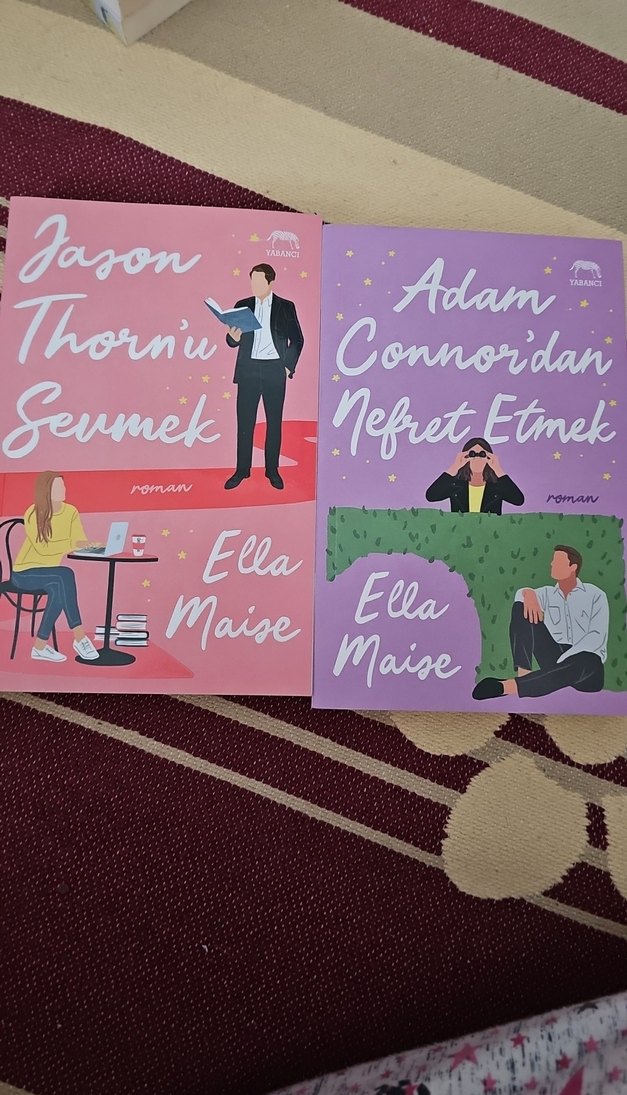 Ella Maise'in yazdığı "Jason Thorn'u Sevmek" ve "Adam Connor'dan Nefret Etmek" adlı iki roman.