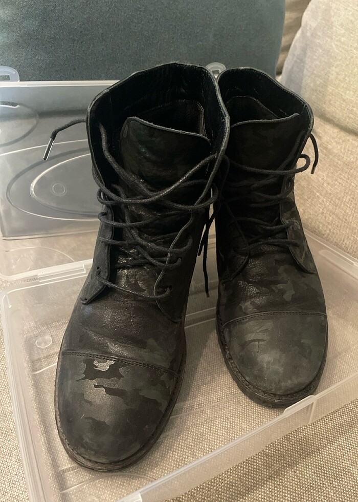Hakiki deridir. Çok zarif bağcıklı bir model. Kamuflajı belli belirsiz ve hafif sedefli gibi. Kusuru yok çok az giyildi