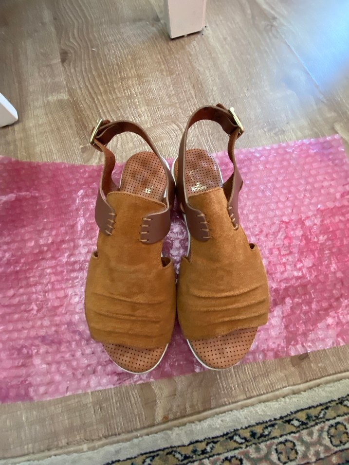 Elle Bej süet malzemeden yapılmış, dolgu topuklu kadın sandaletleri desensiz tasarımıyla rahat, bohem stil için uygundur.