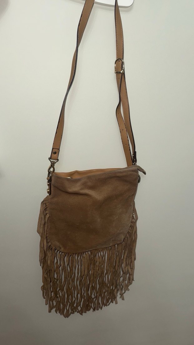 Orijinal deri süet dolap bekliyor püskülleri ondan kat izi olmuş açılması gerekiyor sıkıntısı yoktur Ayarlanabilir askılı, püsküllü bej süet kadın çanta. Günlük kullanıma uygun bohem tarzda.
