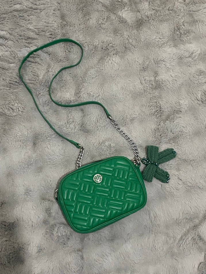 Yeşil renkli, detaylı ve desenli kadın çantası. Sentetik kumaştan üretilmiş, zincir ve deri askıya sahip, gündelik kullanım için uygun.