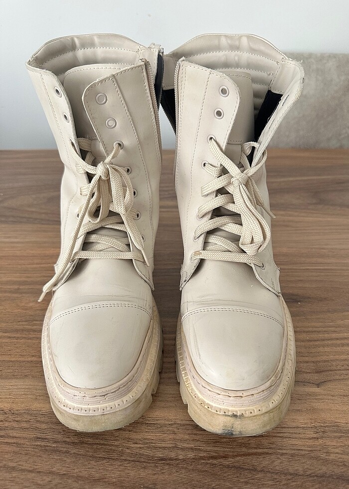Rengi beyaza yakın krem.Sayılı giyildi.yırtık sökük yoktur.açık renk ayakkabı olduğu için daha ilk giymemde kirlendi.lekelenmeleri ve kirleri mevcut hepsini fotoğrafladım.