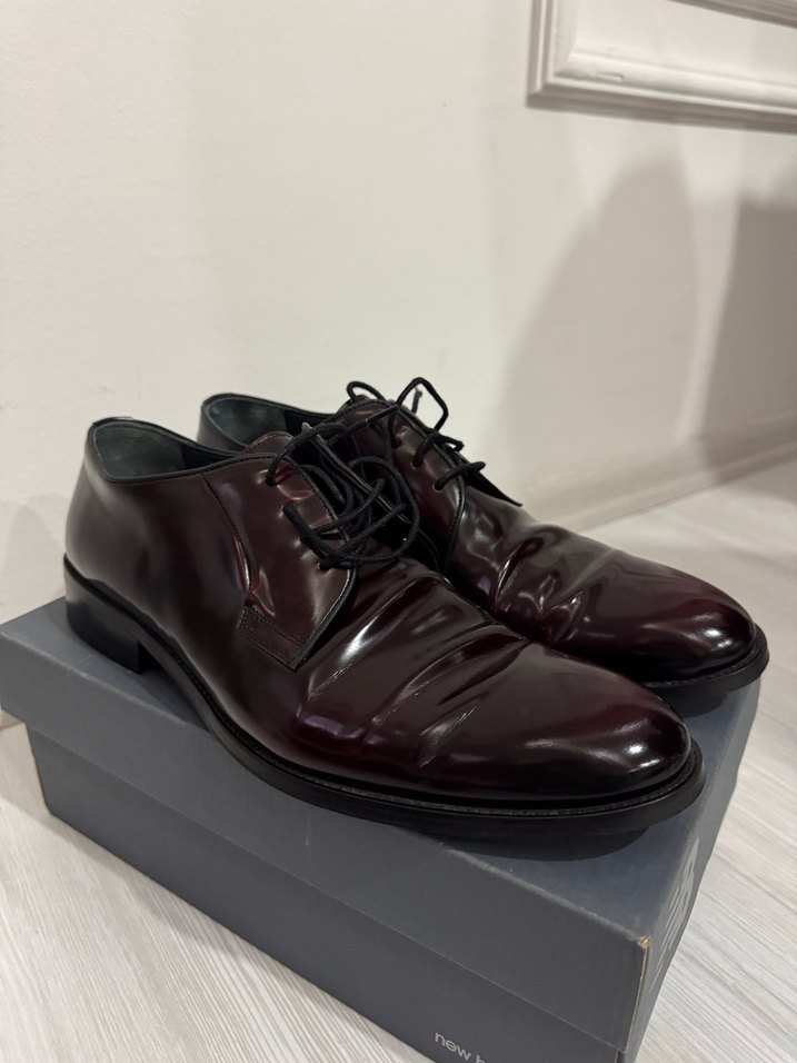 Bordo renkli, parlak rugan görünümlü klasik erkek ayakkabısı. Kauçuk tabanlı, ofis için uygun modern klasik tarzda, desensiz şık model.