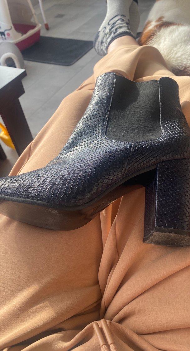Lacivert yılan derisi desenli, tokalı ve blok topuklu kadın botları, çağdaş ve şık bir görünüm sunar. Sadece bir kez giyildi,fermuarlı değil , çorap gibi giyildiği için önü buruşuk, ayağa oturunca formu düzgün duruyor