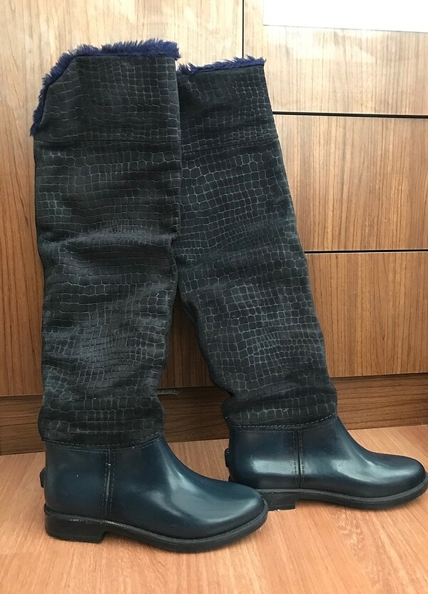 Elle marka dizüstü lacivert çizme. 38 numara. Alt kısmı plastik olduğundan su geçirmez ,yağmur çizmesi olarak da kullanılabilir. İç kısmı kürklü.