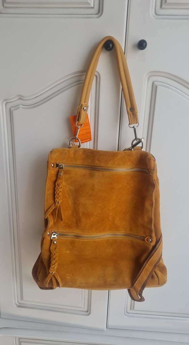 hardal rengi süet fermuarlı, örgü detaylı ve parlak görünümlü kadın çantası. Bohem tarz ve minimal görünüme uygundur. hic kullanilmadi. etiketiyle duruyor