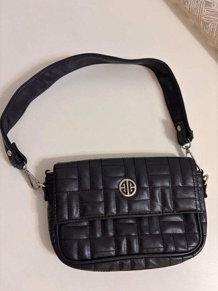 Elle markası siyah deri kadın çantası, kareli desene ve kemerli tasarıma sahiptir. Paris sokak modasına uygun, günlük kullanıma uygundur.
