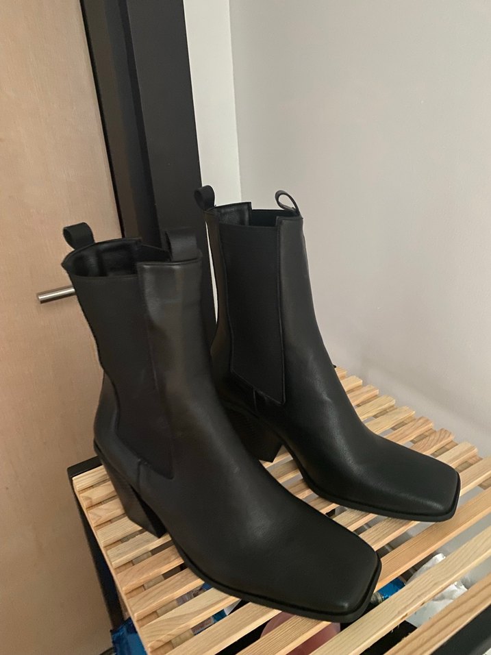 Siyah deri, blok topuklu kadın botu, minimalist gotik tarzda, günlük kullanım için uygundur. Küt burunlu topuk 8 cm. Kutu ile gönderecektir