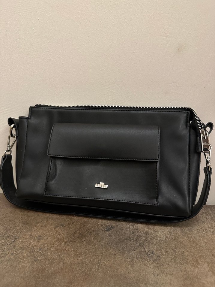 Siyah deri, fermuarlı ve ön cepli kadın çantası. Minimalist tasarımıyla günlük kullanım ve sokak modasına uygundur. Marka yazısının yanında nokta şeklinde çok küçük deri soyulması vardır