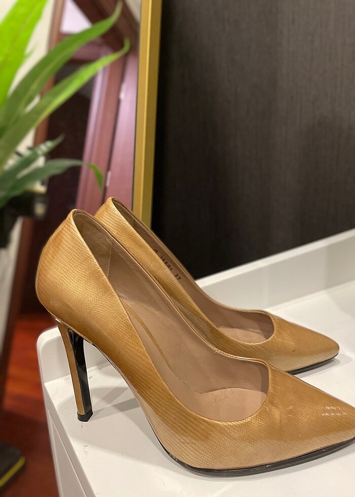 Elle marka yılan derisi görünümlü hardal renk rugan 37 numara ayakkabı, 10 cm ince topuk. Sol ayakkabının kenarında hafif grilik mevcut fotoğrafta belli oluyor. Onun dışında sorunsuz.
