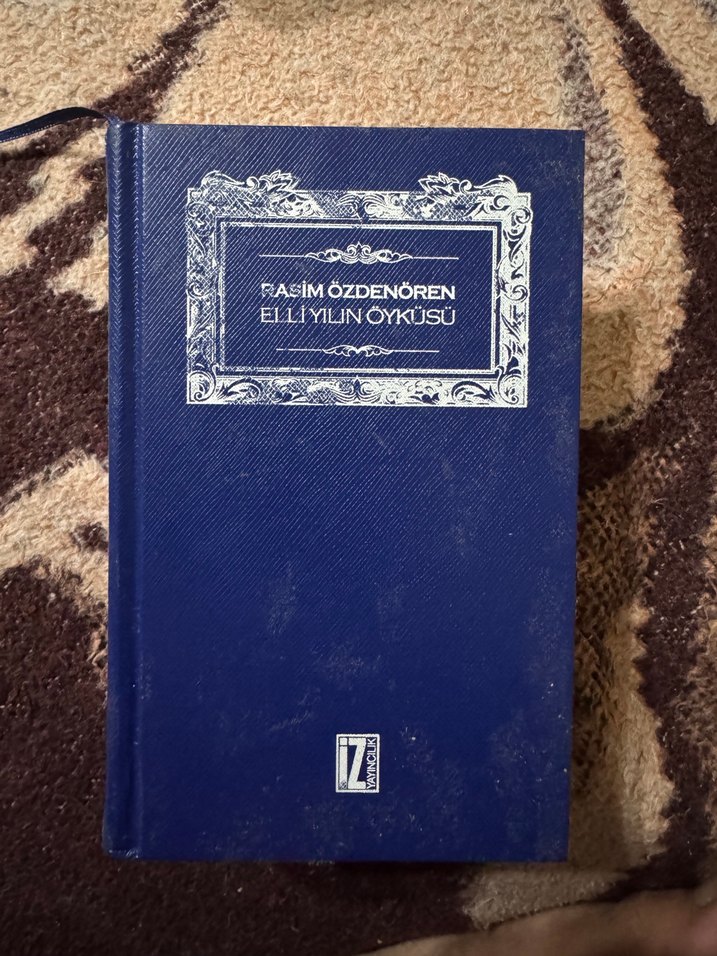 Stoğu tükenen narin ürünlerden. Rasim Özdenören'in 'Elli Yılın Öyküsü' adlı romanı, koyu mavi kapak ve ön yüzünde süslü gümüş çerçeveyle klasik bir cilt tasarımına sahip.