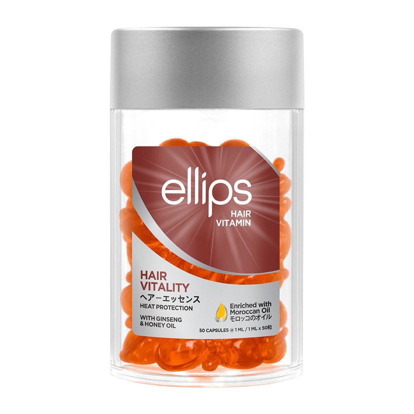 Ellips saç vitamini kapsülleri, saçlara canlılık ve beslenme sağlar. Şeffaf kapta, gümüş kapaklı ve turuncu kapsüllüdür.