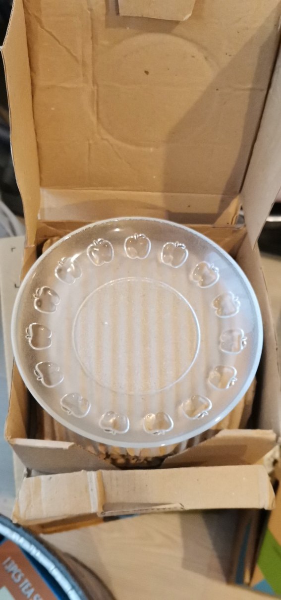 kenarında kabartmalı elma desenleri bulunan klasik ve sade cam tabak. ️18 cm 6 adet kutu içi kullanılmamış.