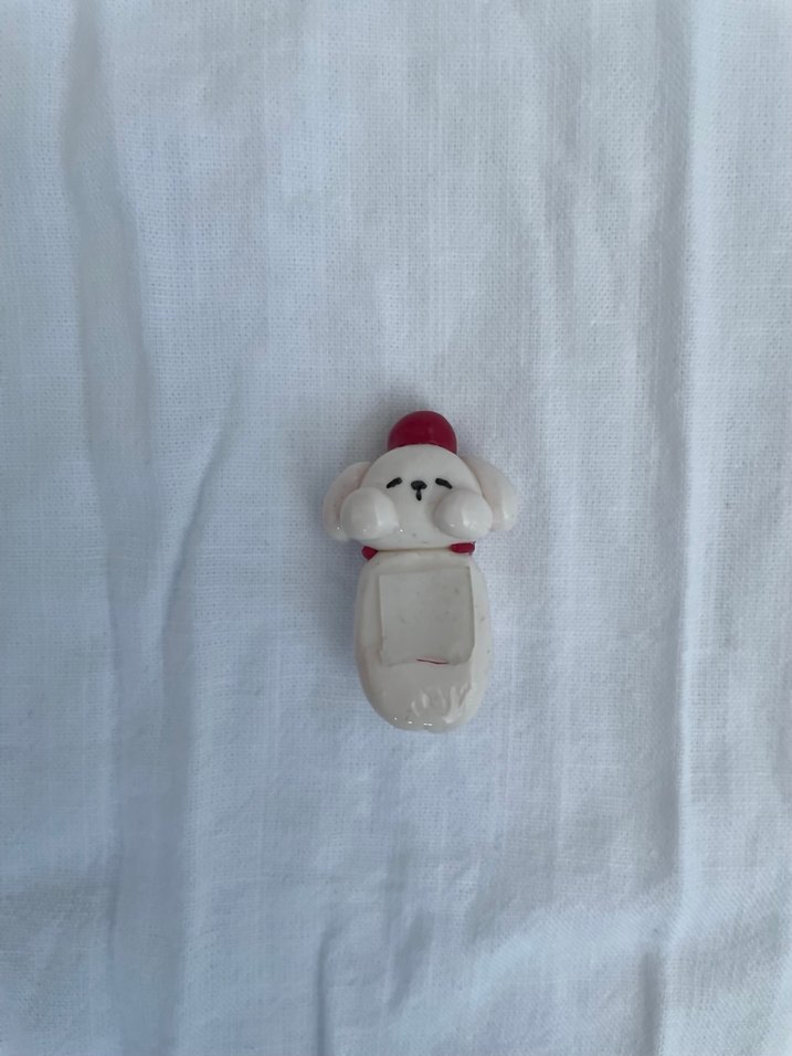 el yapımı polimer kil kırmızı elma şapkalı küçük köpek figürlü telefon aksesuarı , pürüzsüz yüzeyli figürin.