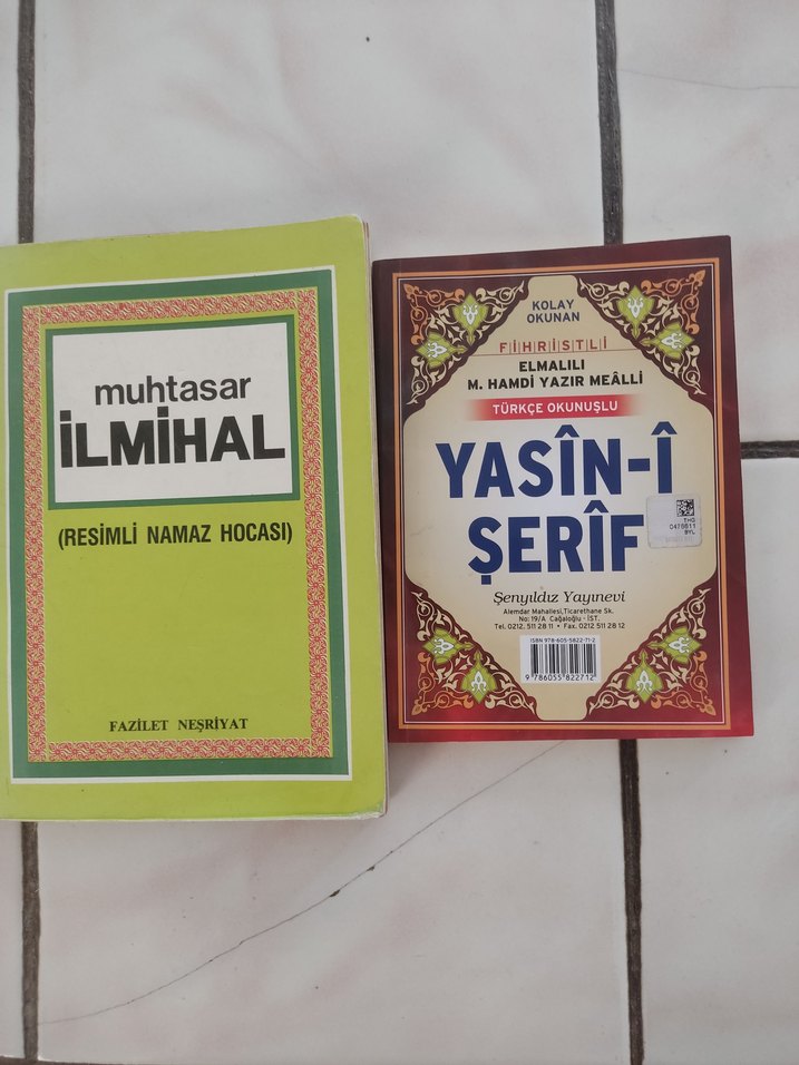 Resimli namaz hocası içeren muhtasar İlmihal ve Türkçe okunuşlu, M. Hamdi Yazır mealli Yasin-i Şerif kitapları .