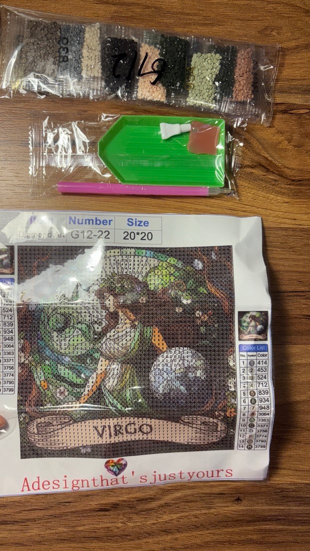 20x20 cm ölçülerinde çok renkli Virgo temalı puzzle, montaj için gerekli tüm araçlarla birlikte gelir.