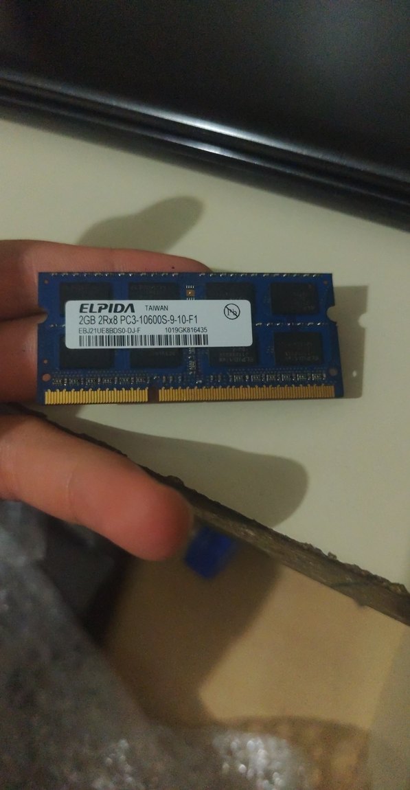 Elpida marka 2GB DDR3 laptop RAM modülü, PC3-10600S hızında çalışır ve koyu mavi devre kartına sahiptir.