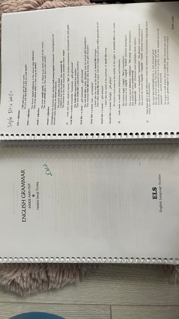 İngilizce dilbilgisi kuralları ve cümle yapısına dair notlar ve alıştırmalar içeren spiralli defter.
