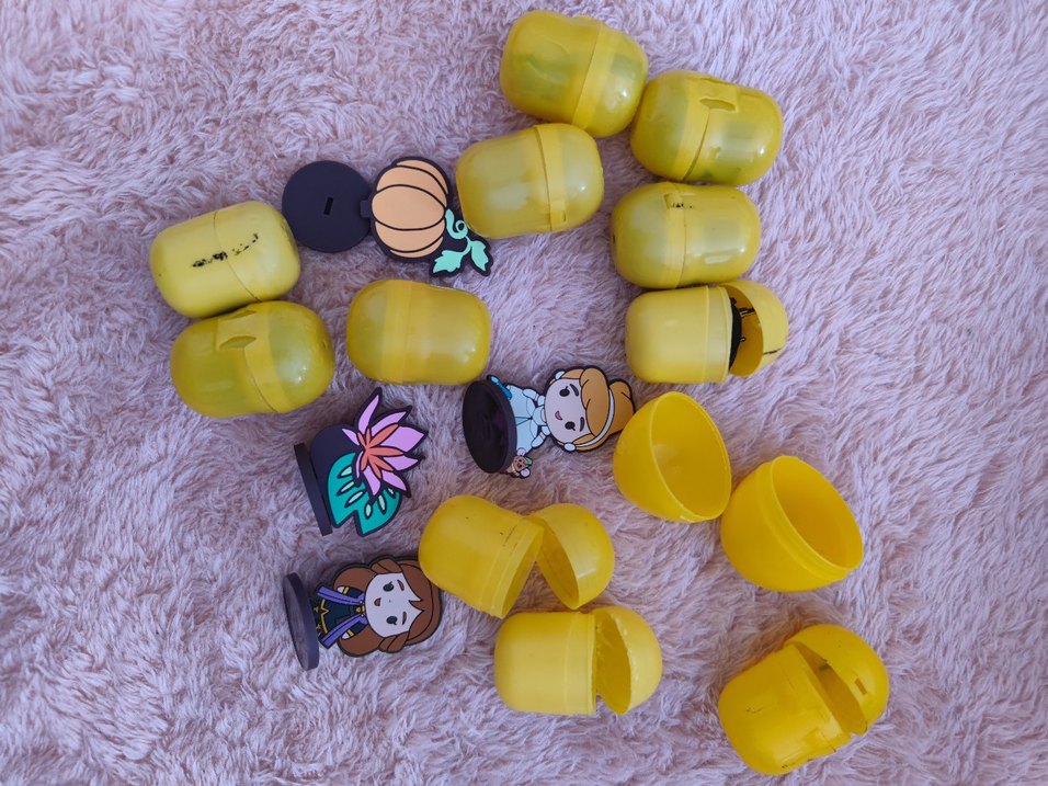 Renkli sarı kapsüller içinde karakter ve nesne figürleri bulunan küçük oyuncaklar. 10 adet