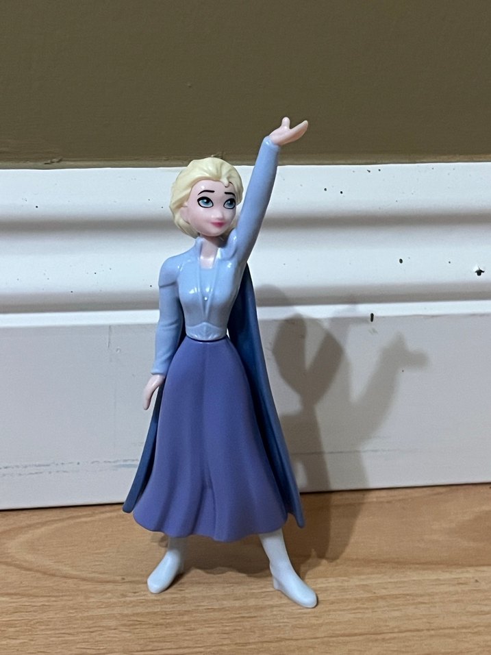 Pastel mavi renkte, uzun elbiseli ve kolu havada poz veren oyuncak bebek figürü. Dayanıklı ve pürüzsüz malzemeden üretilmiştir.