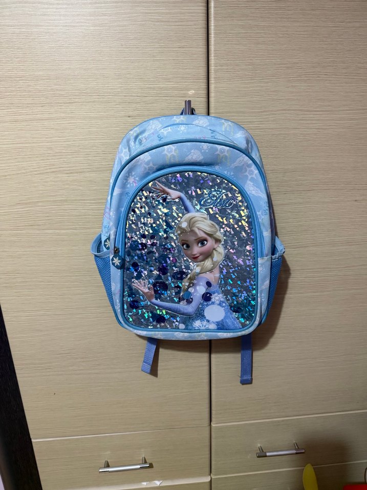 Pastel mavi çocuk sırt çantası, önünde parlak Frozen temalı cep bulunur. Ayarlanabilir askıları ve yan file cepleri vardır.