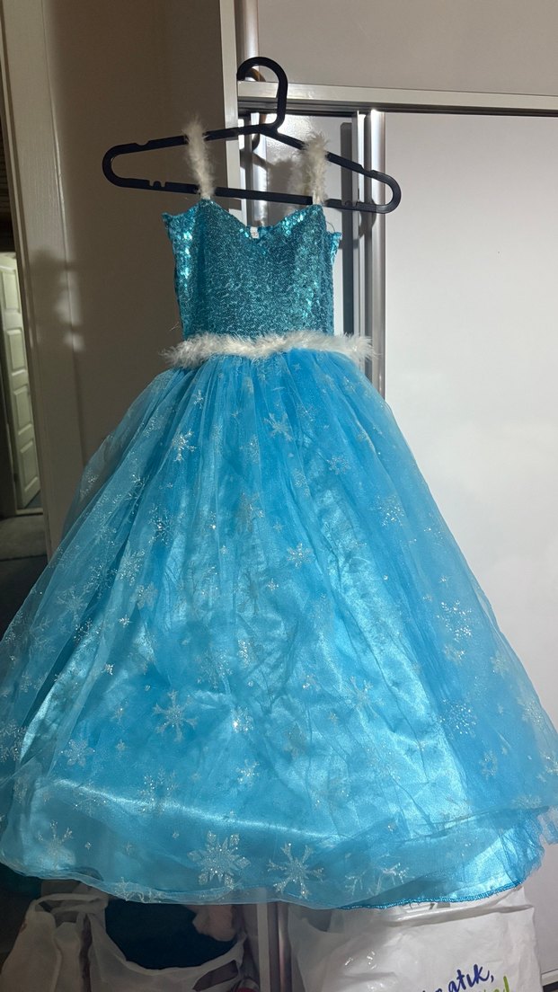 Mavi renkli, straplez ve uzun abiye elbise, vücuda oturan üst kısmı ve parlak kar tanesi desenli etek kısmıyla dikkat çeker. ❄️