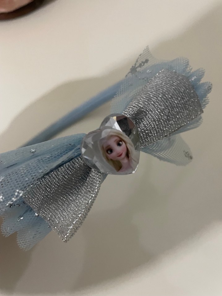 Nakışlı fiyonk detaylı, kalp şeklinde kristal süslemeli mavi saç bandı. Bohem tarzda çocuklara uygun.