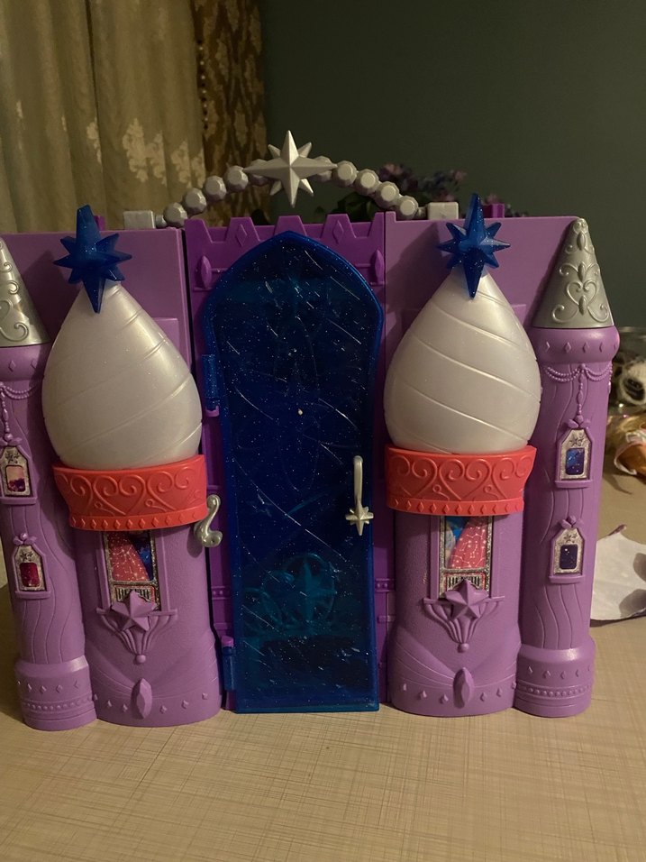 Elsa Mor oyuncak şato açık mor kuleler ve koyu mavi kapıya sahip, yıldız süslemeleri ve detaylı pencere tasarımları içerir.