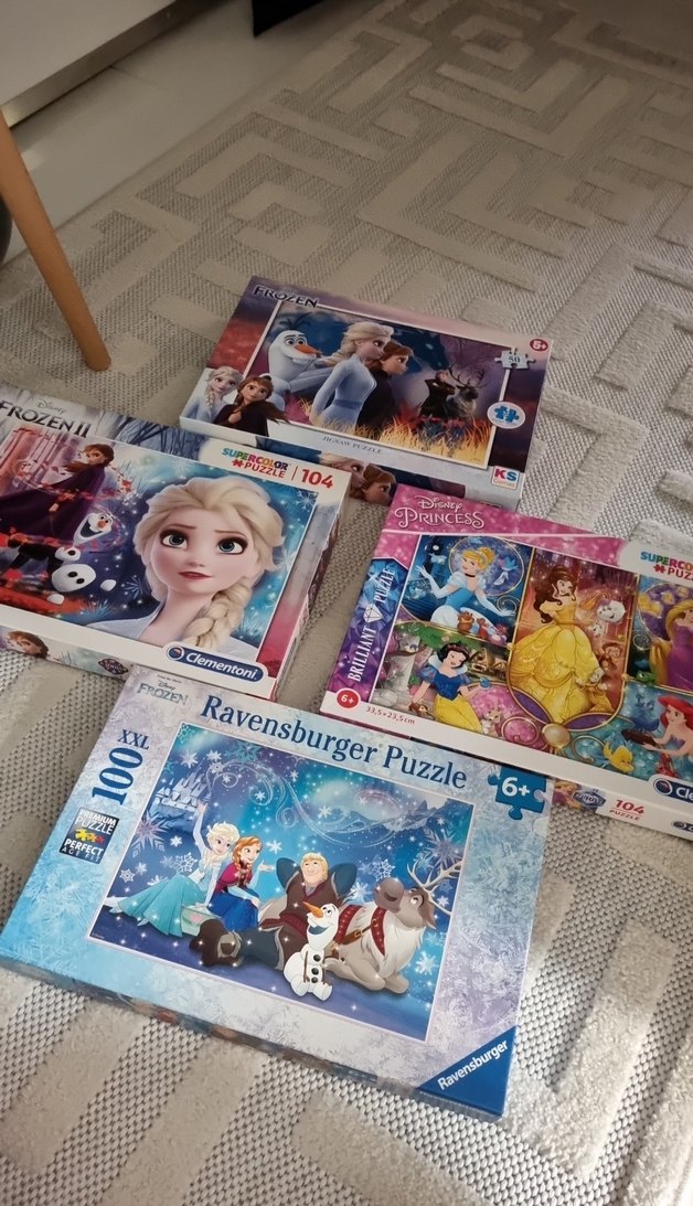 6 yaş ve üzeri çocuklar için Frozen ve Disney Prensesleri temalı renkli puzzle seti.