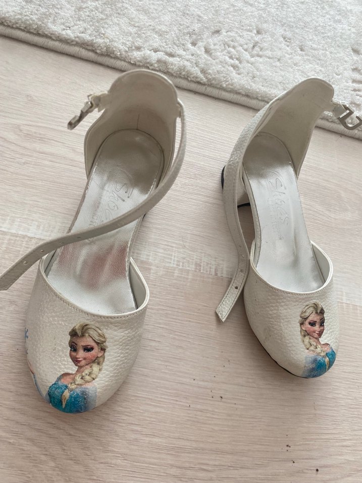 Beyaz tokalı, pastel baskılı desenli kız çocuk bale ayakkabısı, kauçuk malzemeden klasik görünümlü. Marka temsilidir.