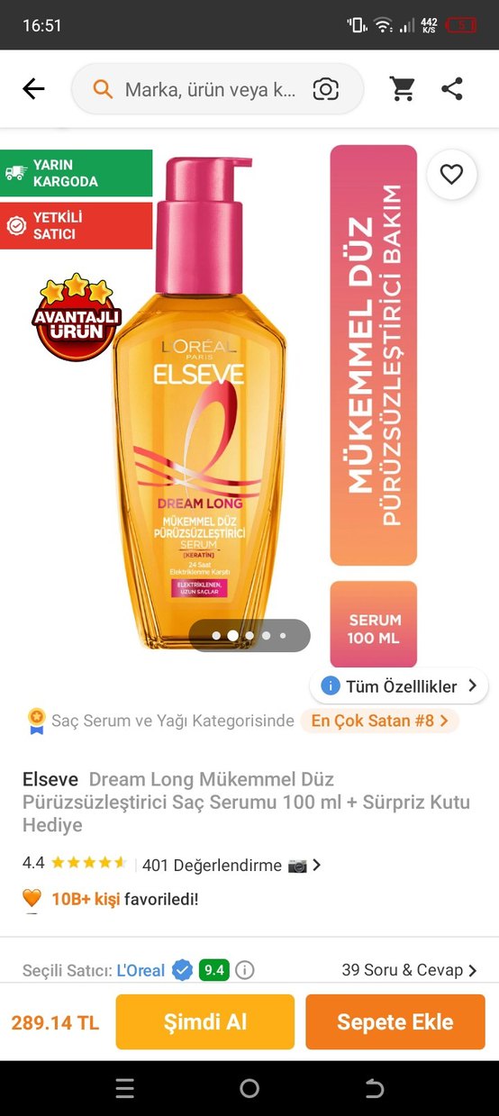 Elseve Dream Long serumu, 100 ml şişede saçları pürüzsüzleştirir ve düzleştirir. Sürpriz hediye kutusu ile birlikte gelir.